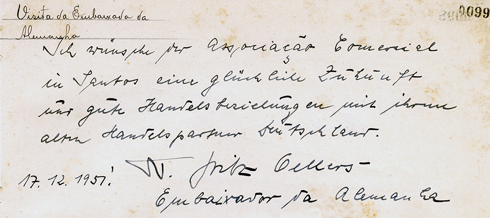 Durante a visita oficial de 18 de dezembro de 1951, o embaixador da Alemanha no Brasil, Fritz Oellers, registrou sua passagem pela Associação Comercial de Santos com uma mensagem manuscrita no Livro de Ouro da entidade. No texto, datado de 17 de dezembro de 1951, o diplomata expressou votos de uma “feliz atuação” da Associação e destacou a importância de boas relações comerciais entre Santos e a Alemanha, reafirmando o interesse de seu país no fortalecimento dos vínculos econômicos com o Brasil. A assinatura de Oellers no Livro de Ouro tornou-se um testemunho histórico da aproximação institucional entre a comunidade empresarial santista e a representação diplomática alemã no período pós-guerra.