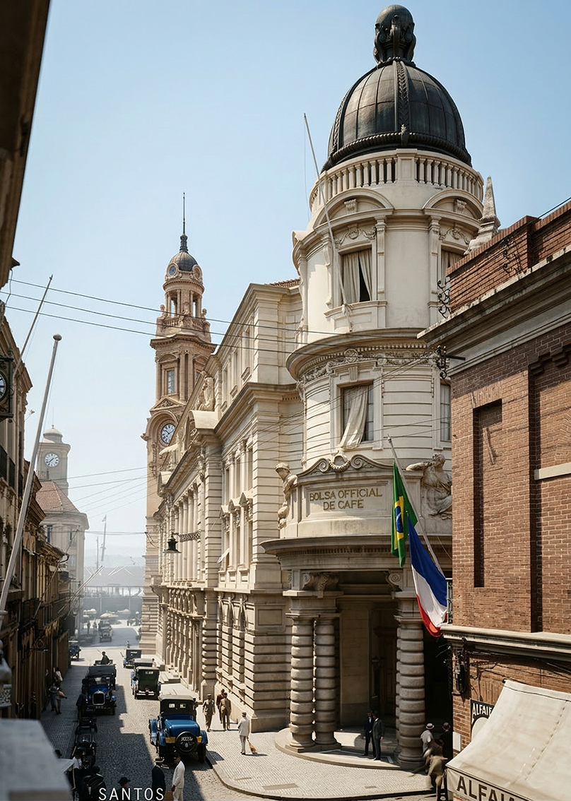 Naquele período, Santos era o principal ponto de saída do café brasileiro e um dos maiores centros do comércio mundial do produto. A atividade portuária era intensa. Navios chegavam e partiam constantemente, carregando sacas de café destinadas a mercados consumidores na Europa e nas Américas. Armazéns estavam abastecidos, exportadores organizavam embarques e companhias marítimas operavam em ritmo acelerado.