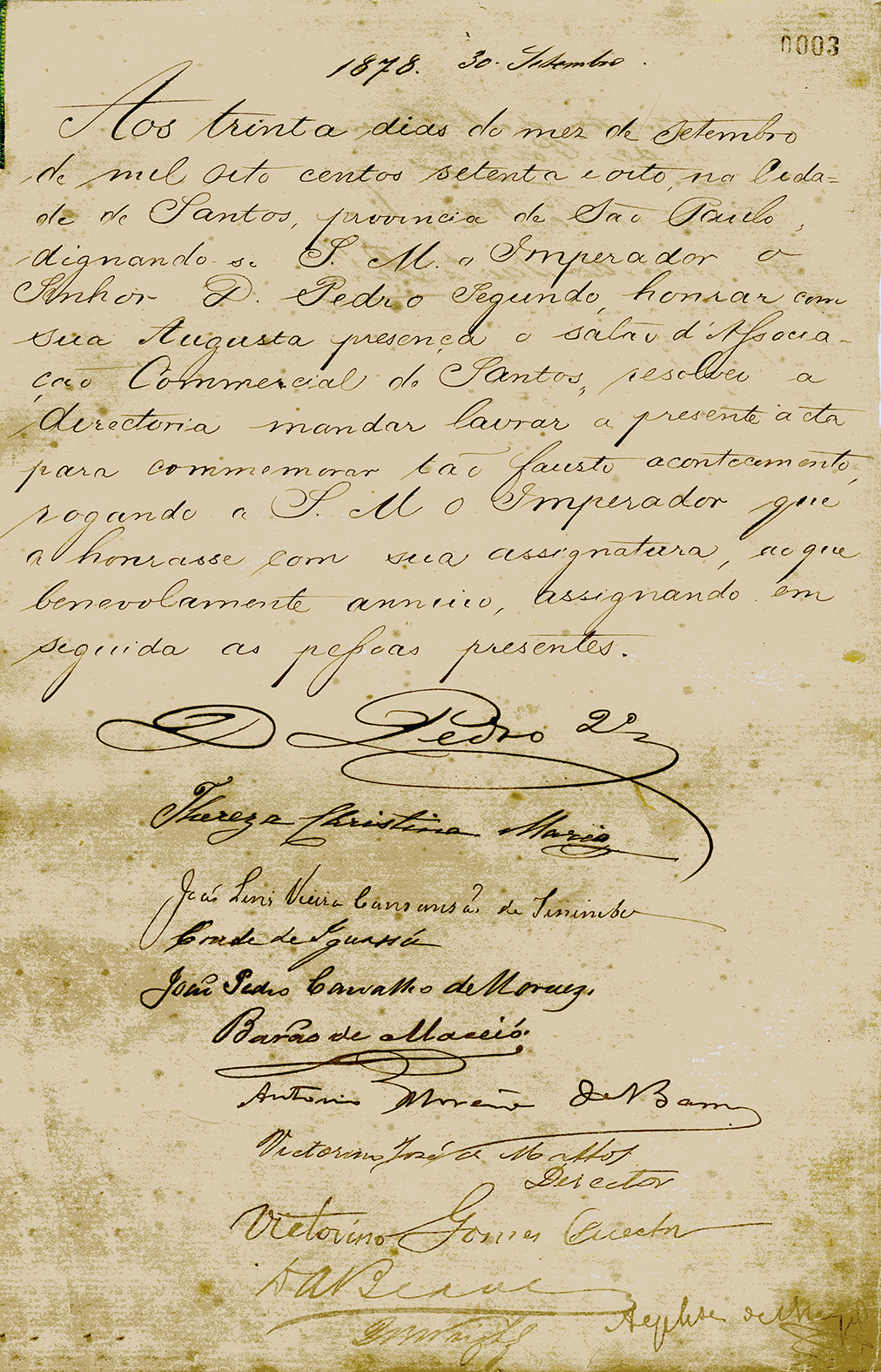 “Aos trinta dias do mês de setembro de mil oitocentos setenta e oito, na cidade de Santos, província de São Paulo, dignando-se S. M. o Imperador o Senhor D. Pedro Segundo honrar com sua augusta presença o salão da Associação Comercial de Santos, resolveu a Diretoria mandar lavrar a presente ata para comemorar tão fausto acontecimento, rogando a S. M. o Imperador que a honrasse com sua assinatura, ao que benevolente anuiu, assinando em seguida as pessoas presentes: D. Pedro 2º; Thereza Christina Maria; João Lins Vieira Cansanção de Sinimbu, Conde de Iguassú, João Pedro Carvalho de Moraes, Barão de Macaé; Antonio Moreira de Barros; Victorino José de Mattos, diretor; Victorino Gomes, entre outros”