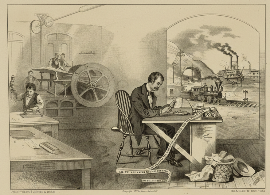 É também nesse cenário de espera, de projetos e de disputas econômicas que chega a Santos a tecnologia do telégrafo, acompanhando outras inovações oriundas da Europa. Se o porto ainda era improvisado, a comunicação começava a integrar a cidade à rede internacional de informações. Para uma praça que aspirava à modernidade e buscava consolidar-se como centro estratégico do comércio cafeeiro, a rapidez na circulação de notícias tornava-se tão essencial quanto a construção de cais e armazéns. A cidade que sonhava com um porto organizado passava, simultaneamente, a experimentar a revolução da comunicação instantânea.
