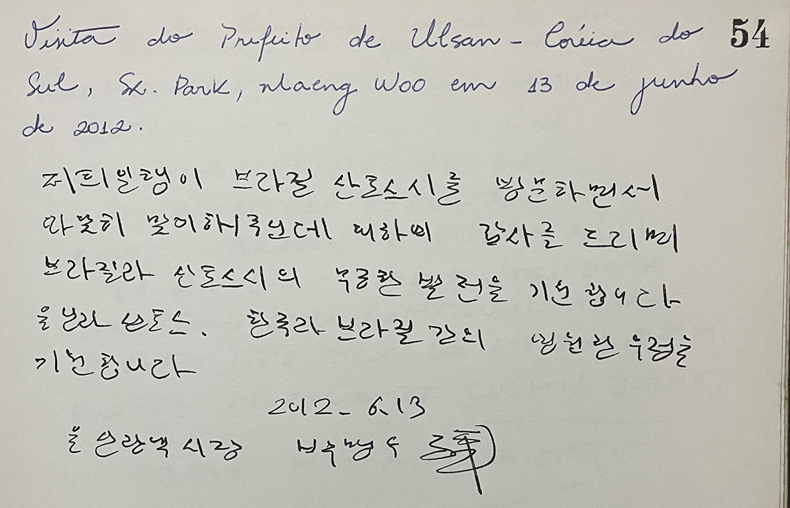 “Agradeço pela calorosa recepção oferecida à nossa comitiva durante a visita à cidade de Santos, no Brasil. Desejo o contínuo e ilimitado desenvolvimento do Brasil e da cidade de Santos. Também desejo a eterna amizade entre a cidade de Ulsan, a Coreia e o Brasil.