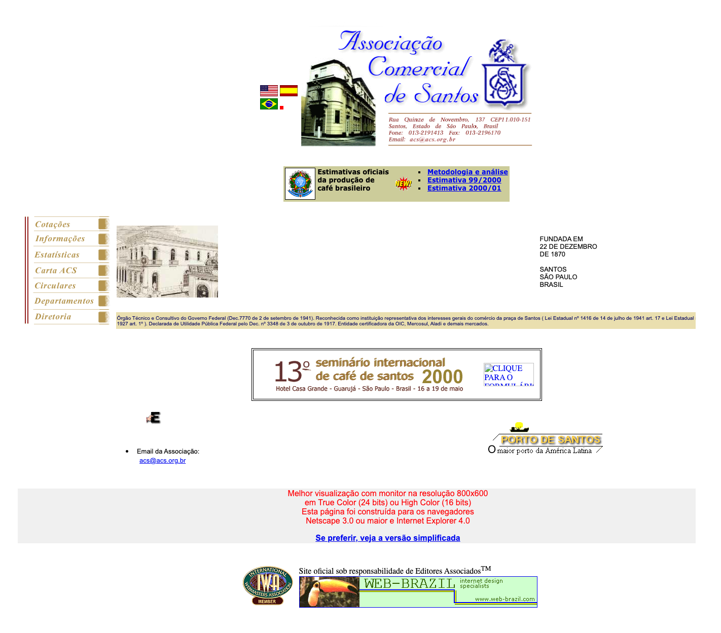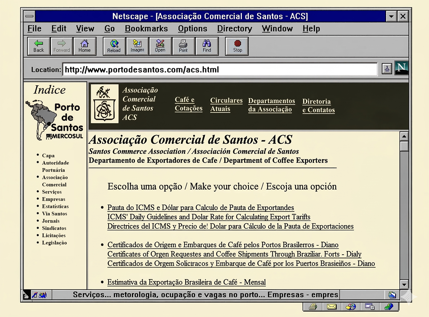 Foi nesse ambiente pioneiro que surgiu, em 1996, a home page da Associação Comercial de Santos, integrada ao portal do Porto de Santos. O site apresentava a entidade ao mundo e disponibilizava serviços e estatísticas de seus 21 departamentos, começando pelo setor cafeeiro, historicamente central na economia santista. O acesso podia ser feito diretamente pelo endereço www.portodesantos.com/acs.htm ou a partir da página principal do portal do porto, onde também estavam reunidas informações sobre movimentação de cargas, entrada e saída de navios, legislação portuária, sindicatos e outros dados relevantes para o comércio marítimo.